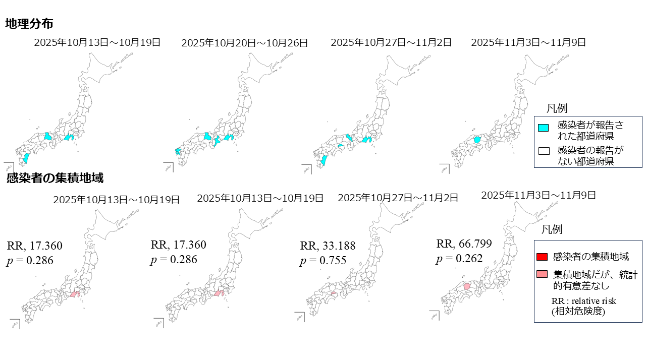 ・週ごとの疾患集積性の空間解析では、42週(10月13日から10月19日、p=0.286)、43週(10月20日から10月26日、p=0.243)、44週(10月27日から11月2日、p=0.169)、45週(11月3日から11月9日、p=0.262)は、いずれも集積地域は同定されませんでした 。
