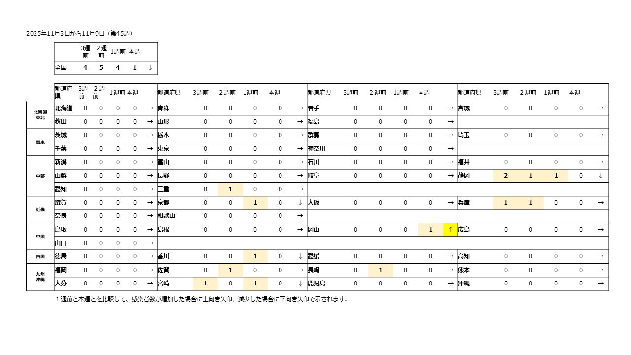 ・直近4週間におけるSFTS報告数は、42週(10月13日から10月19日)には静岡で2人、兵庫で1人、宮崎で1人の計4人でした。43週(10月20日から10月26日)は、静岡1人、三重1人、兵庫1人、佐賀1人、長崎1人と5人でした。44週(10月27日から11月2日)は静岡1人、京都1人、香川1人、宮崎1人でした。今週45週(11月3日から11月9日)は岡山1人でした 。