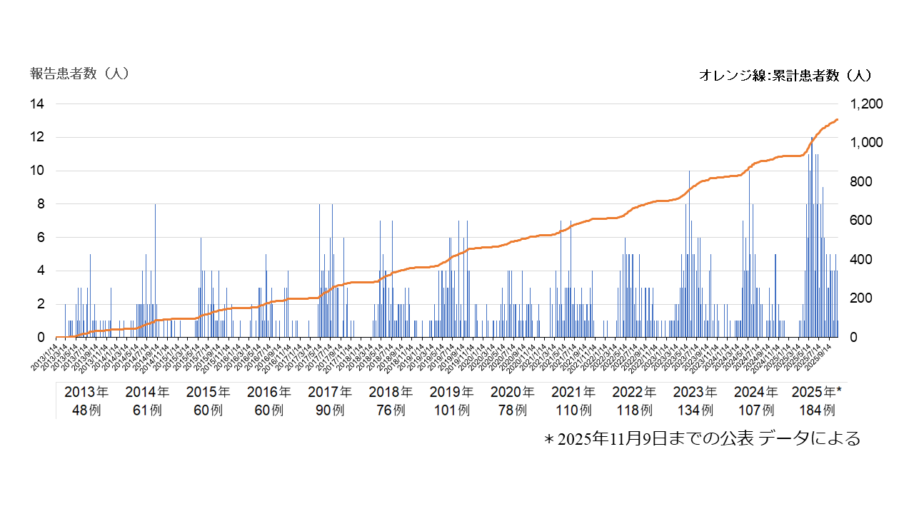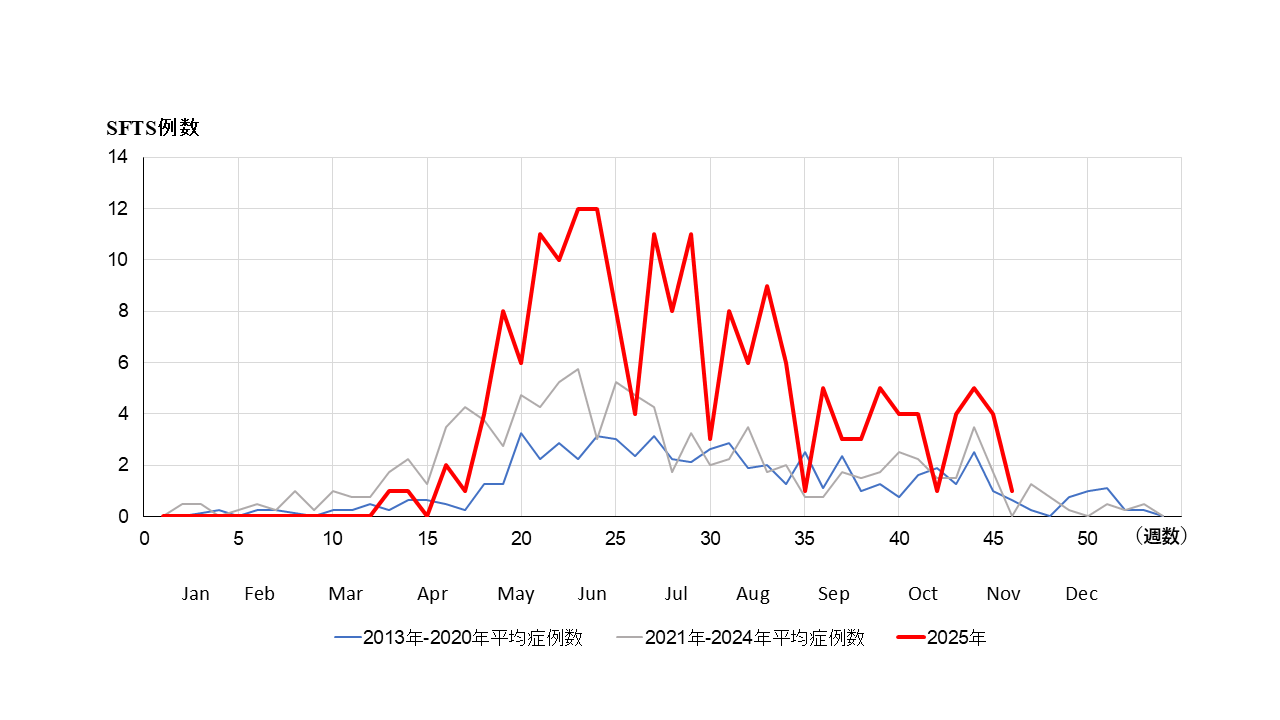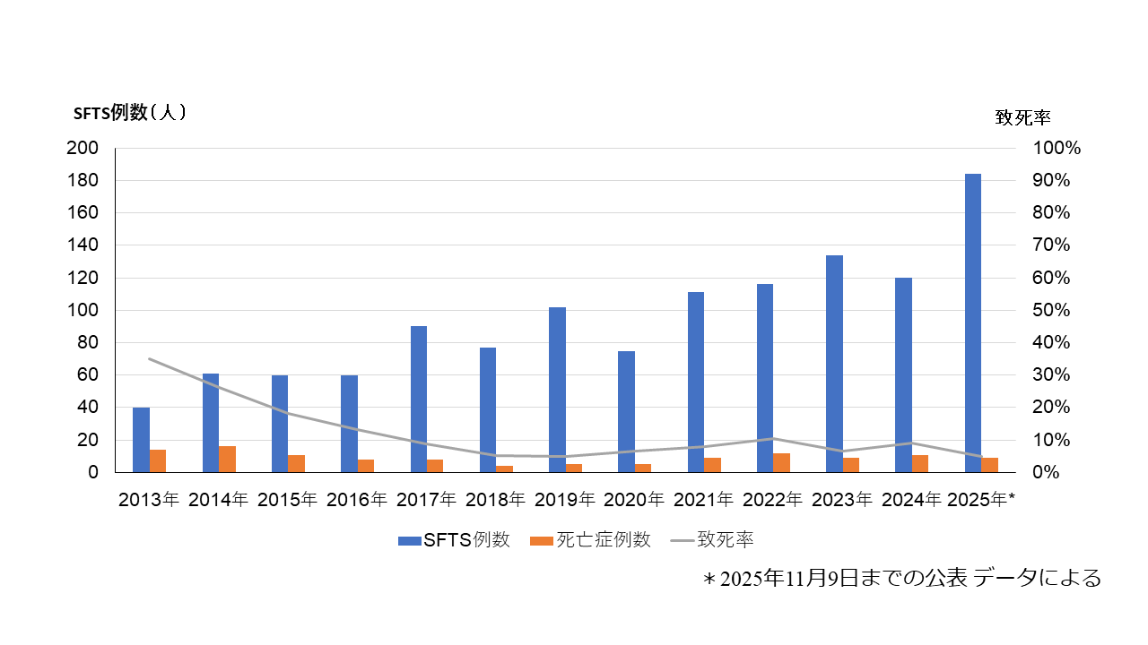 ・SFTSは2025年5月以降、例年を上回る急増を示し、第45週(11月9日現在)までにすでに184名の患者が報告されています(うち死亡9名、致死率4.9%) 。
