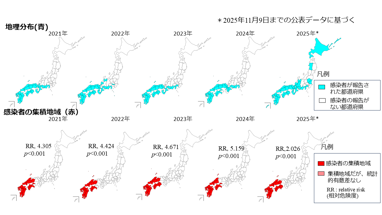 ・2021年から2025年まで、年ごとに患者発生状況を解析すると、感染者が集積している地域は、九州と四国の全地域、および中国地方の一部です。。